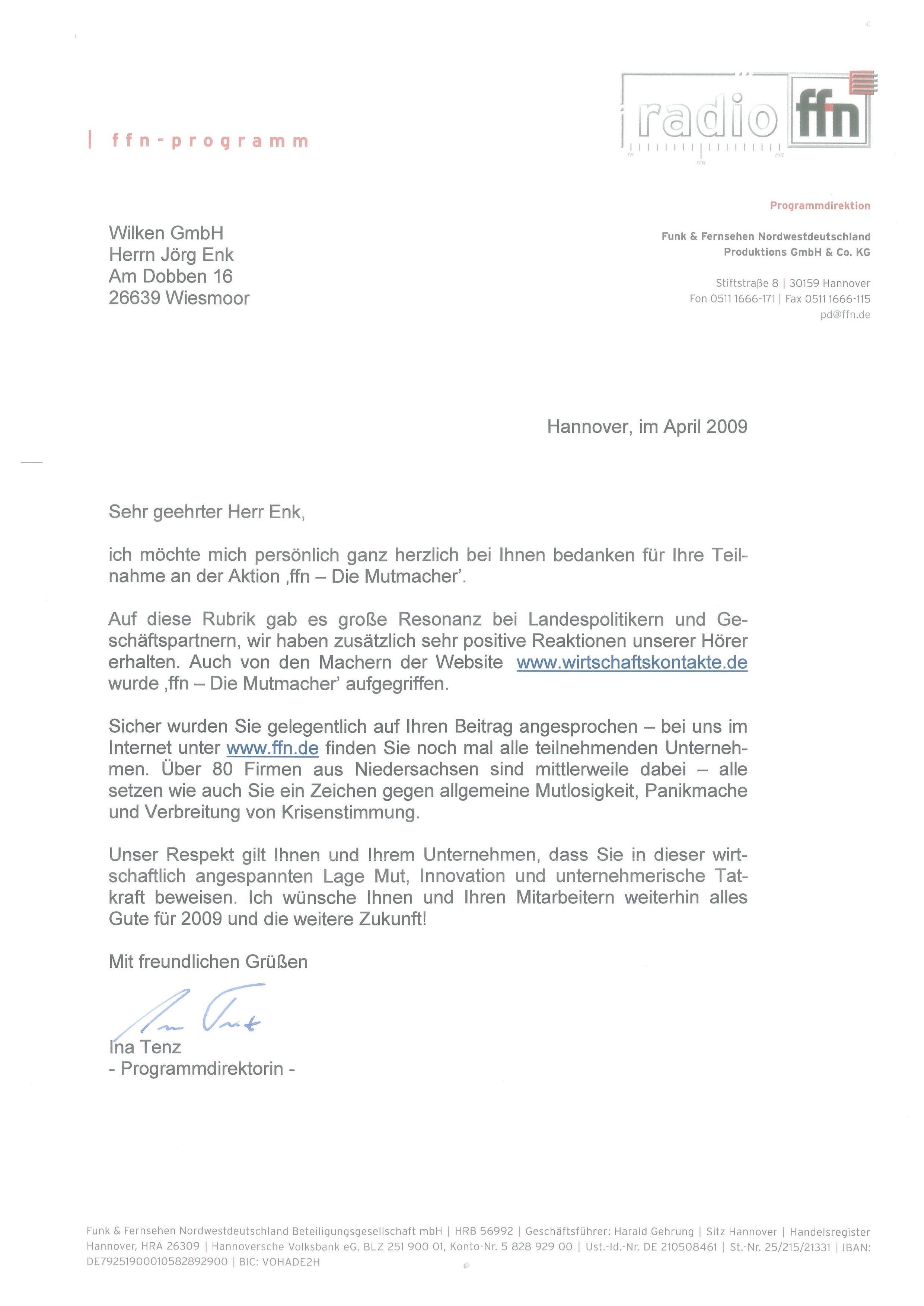 Im April 2009 stattete Radio FFN der Wilken GmbH einen Besuch ab. Für die Rubrik "Die Mutmacher" wurde die Geschäftsleitung nach der zukünftigen Ausrichtung des Unternehmens interviewt.