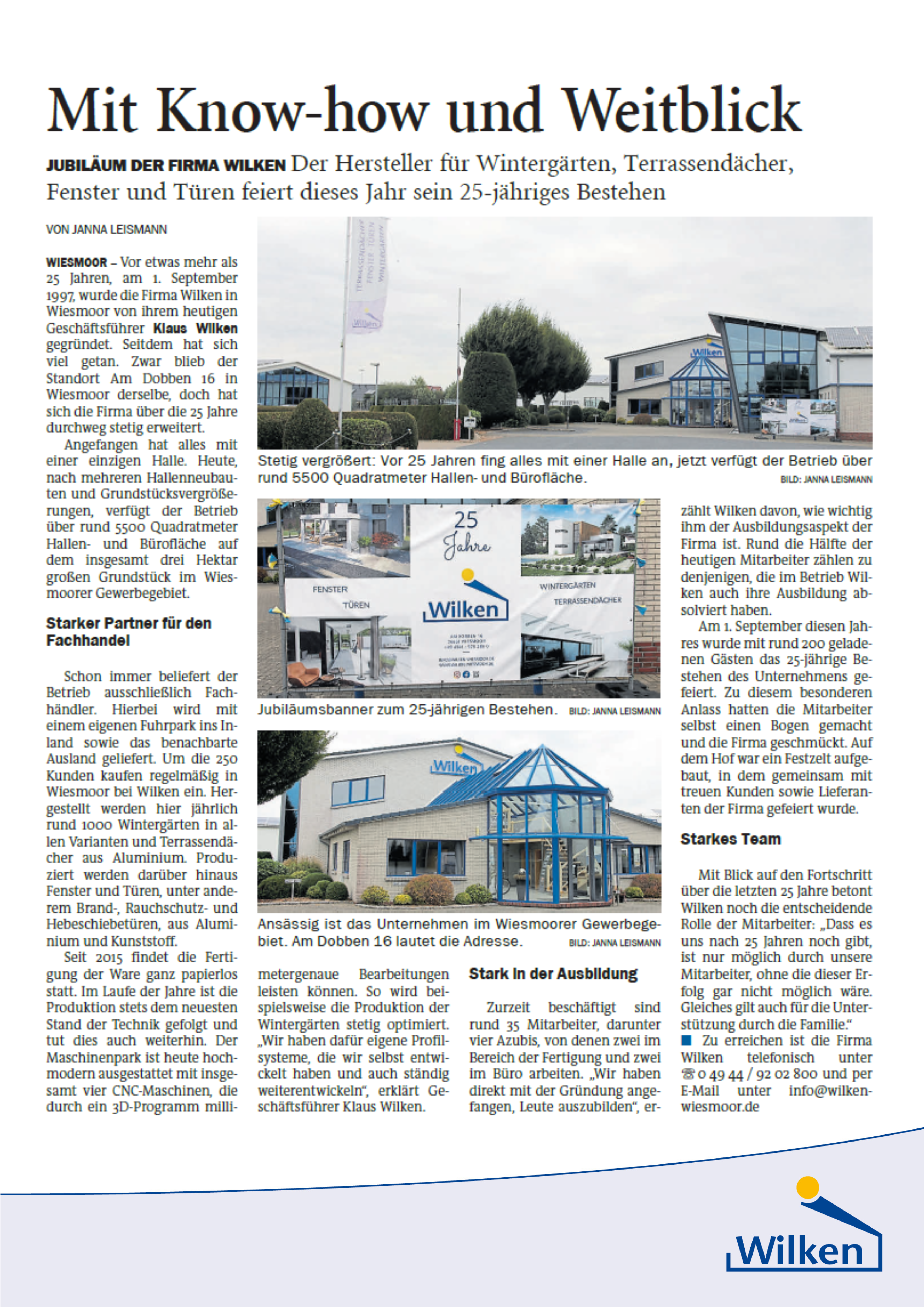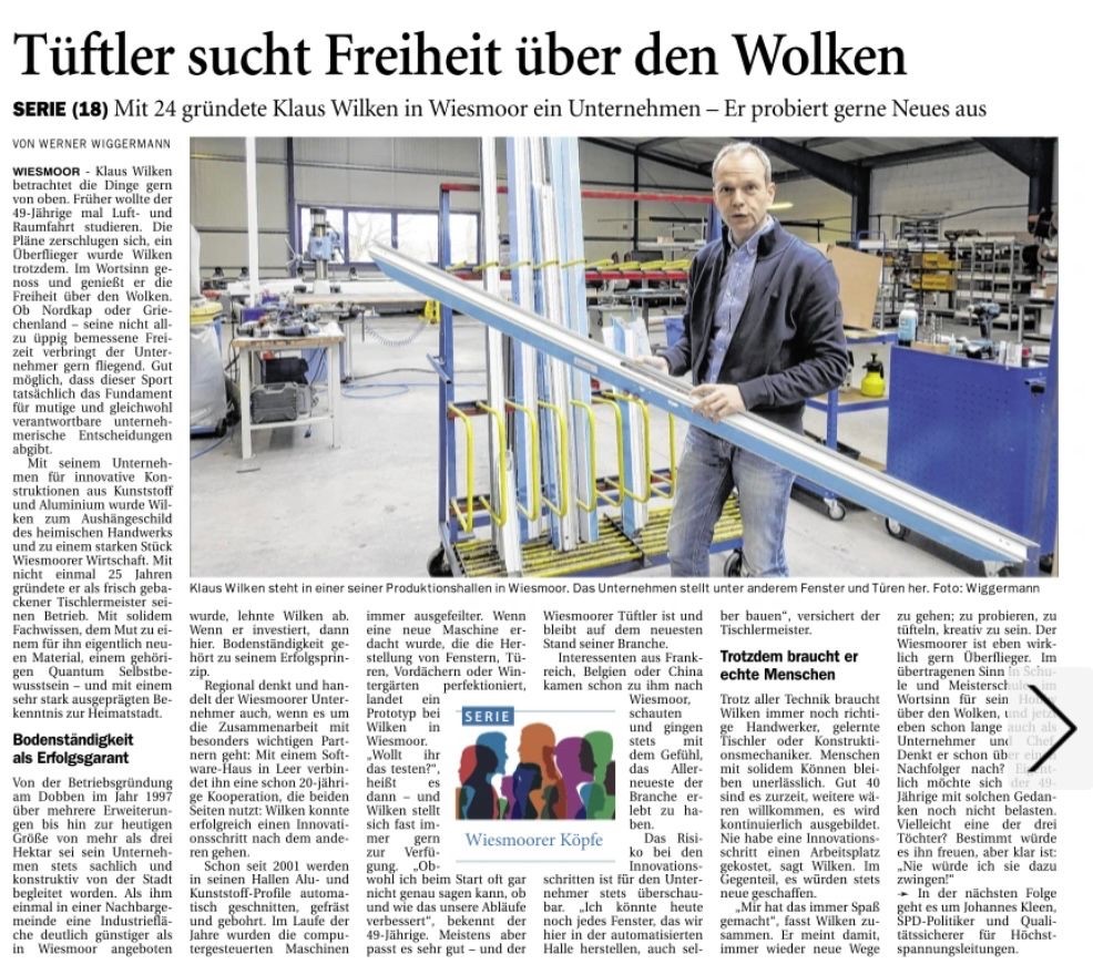 Für die OZ-Serie "Wiesmoorer Köpfe" hatten wir in der vergangenen Woche einen Kollegen der örtlichen Zeitung zu Besuch. Herausgekommen ist ein toller Bericht, der einen Einblick in 25 Jahre berufliche und persönliche Geschichte unseres Geschäftsführers, Klaus Wilken gibt.